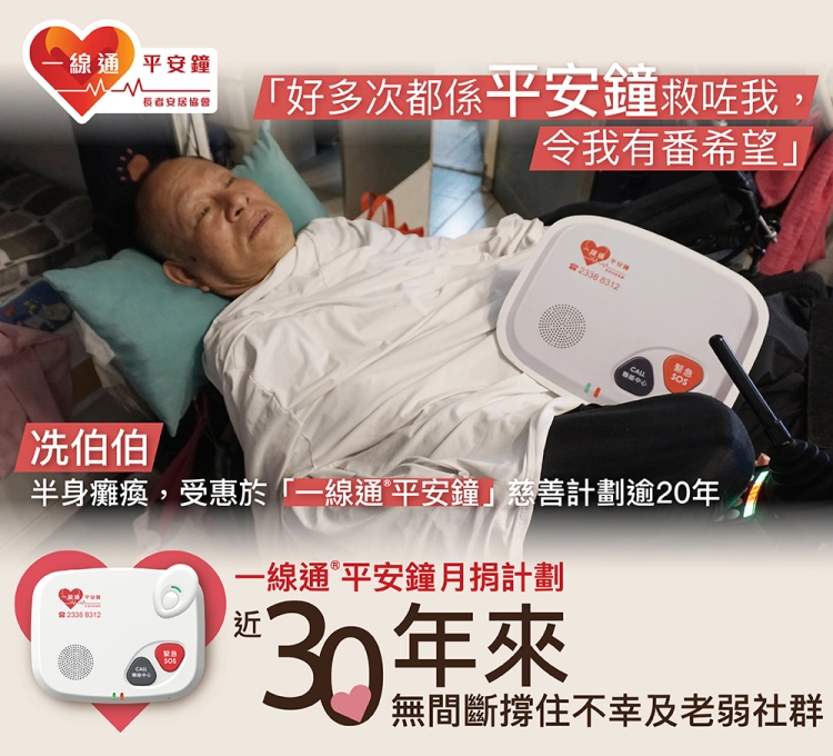 63歲的冼伯伯,年輕時曾是充滿活力的運動愛好者,卻因一場意外導致頸椎受創,從40歲起便陷入癱瘓,僅餘說話與輕微活動手部的能力。在人生最艱難的時刻,長者安居協會的「一線通®平安鐘」慈善計劃成為他生命中最重要的支持,陪伴他走過超過20年的歲月。