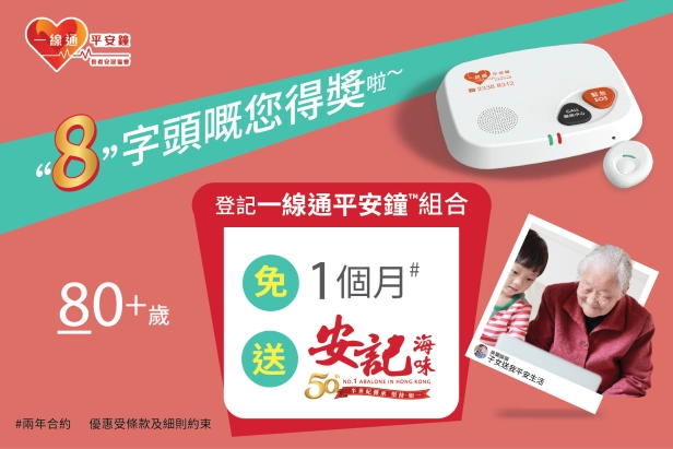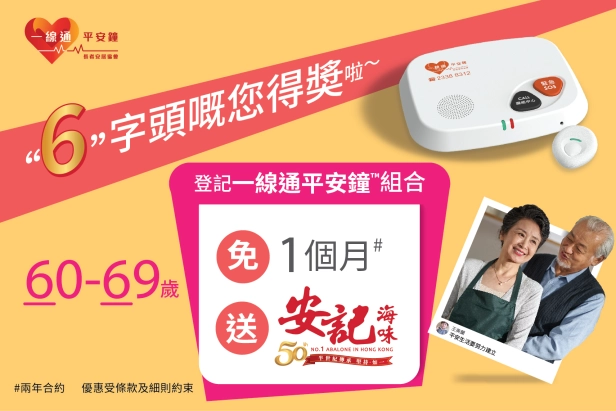 為慶祝成立27周年,協會發起「678優惠」活動,即日起至2月29日,60至80歲以上新用戶登記「一線通平安鐘™」或組合,可享月費優惠或安記海味禮品,其中70至79歲「老友記」更可享高達3年合約其中2年半價*優惠,而另外合資格長者,亦可享兩年合約免一個月加送豐富安記海味禮品禮遇。