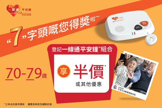 推廣期內,符合以下資格的全新客戶可享有專屬優惠: - 60至69歲 或 - 80歲或以上 1. 「一線通平安鐘™」買兩年免一個月月費及送價值$434「安記海味 x 一線通平安鐘™鮑魚福袋」或 2. 「一線通智守護®」APP買兩年免一個月月費及送價值$434「安記海味 x 一線通平安鐘™鮑魚福袋」或 3. 「一線通平安鐘™」加「一線通智守護®」APP組合,買兩年免一個月月費及送價值$642「安記海味 x 一線通平安鐘™尊貴海味福袋」 - 70至79歲 1. 「一線通平安鐘™」、「一線通智守護®」APP或「一線通平安鐘™」加「一線通智守護®」APP組合,買三年可享其中兩年半價或其他優惠