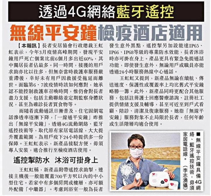 《東方日報》透過4G網絡藍牙遙控 無線平安鐘檢疫酒店適用