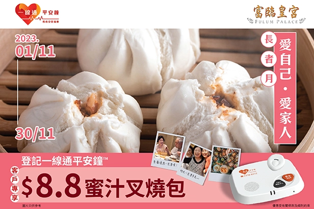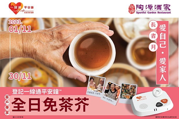 適逢十一月是「長者月」,長者安居協會發起「愛自己.愛家人」行動,第一炮與知名餐飲企業富臨集團及陶源酒家聯乘,為「一線通平安鐘TM」用戶提供專屬長者月福利。各位訂戶會收到由長者安居協會發出的專屬電郵,於11月1日至11月30日只需持電郵電子版或列印版,即可於全線富臨酒樓享有「$8.8換購蜜汁叉燒包」,或/及於全線陶源酒家享有「全日免茶芥」優惠。優惠在長者月內可以重複使用,令照顧者或長者都可以齊齊「飲個茶,食個包」,享受生活。