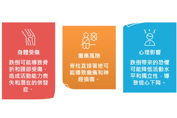 跌倒導致長者產生恐懼和降低他們的活動能力,失去獨立性或自理能力,身體受傷和信心下降會引發一系列的連鎖反應。