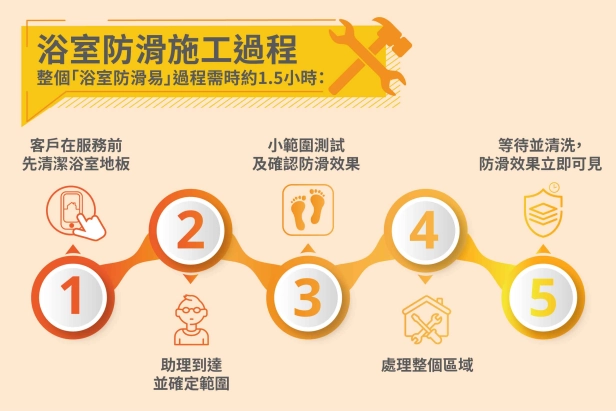 浴室防滑易服務無需額外設備,無需裝修,我們的專業技術能在濕滑環境中提升地板摩擦力,有效降低滑倒風險,為您打造更安全的浴室環境。