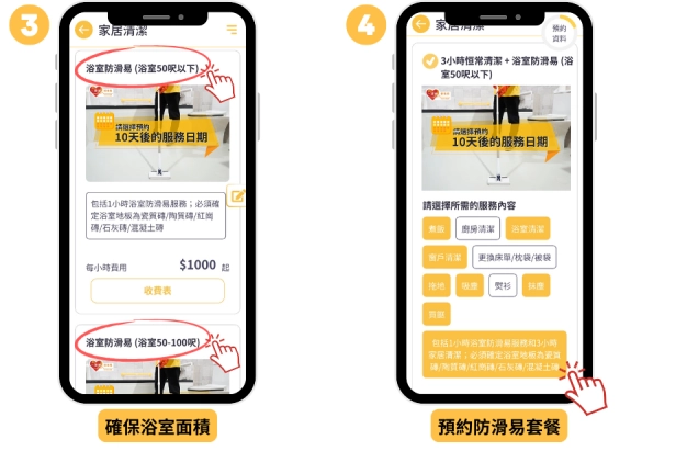 確定浴室地面面積並點選正確服務選項。預約前需要確認浴室地磚為瓷質磚、陶質磚、紅崗磚、石灰磚或混凝土磚。「浴室防滑易」預設預約時數為1小時。