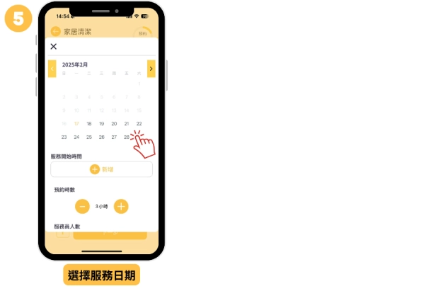 請選擇服務日期時,必須選擇至少10天後的服務日子。 完成付款後,即開始配對人手。配對狀況可以留意主頁中的『預約』頁面。