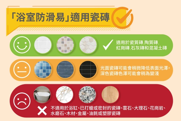 「浴室防滑易」僅適用於瓷質磚、陶質磚、紅崗磚、石灰磚和混凝土磚。