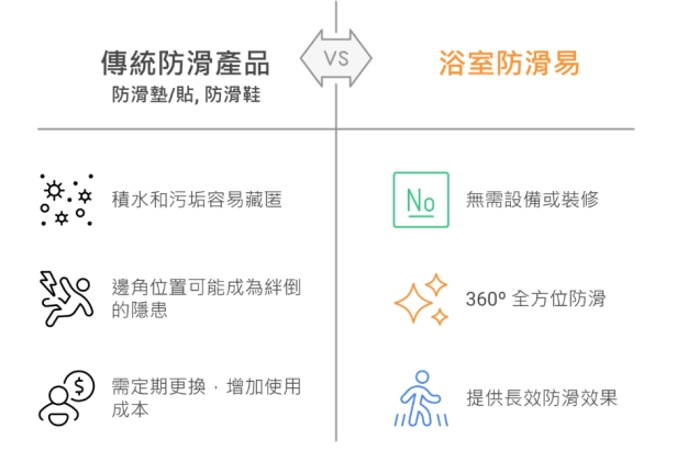 對比市場上,浴室防滑墊和防滑居家拖鞋常見的防滑產品,各有其局限性。防滑墊雖然提供即時的防滑效果,但容易積水和污垢,防滑鞋其有效性依賴於是否穿著,限制了行動自由,而浴室防滑易可以輕鬆解決以上問題,達到防滑、持久長效的效果。